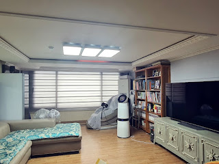 그다음에 정말 고민 많이 했던 장소가 거실이래요 집의 첫인상을 좌우하는 곳이 거실이라 대충 결정하지 못해 신경을 많이 썼죠. 저희 집에 가전제품이나 기존에 있던 가구들이 갈색이나 어두운 톤의 색채가 많아서 밝은 색상을 선택해서 설치했습니다. 창문 옆 사이즈가 생각보다 커서 블라인드는 3개에 맞게 달아달라고 했는데요. 햇빛이 들어오는 방향에 따라서 조절할 수 있는 점이 좋았어요 가족이 가장 많이 묵는 곳이라 청소가 편리해야 하는데 물티슈로 닦아주면 일감이 훨씬 줄었어요.