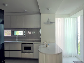 가로폭이 조금 좁은 공간에는 울산 커튼으로 분위기를 만들어 보았습니다. 화이트 컬러로 인테리어 된 주방 옆 공간은 쉬폰 커튼으로 장식했습니다. 햇볕이 잘 들고 벽지나 가구랑도 잘 어울리거든요.