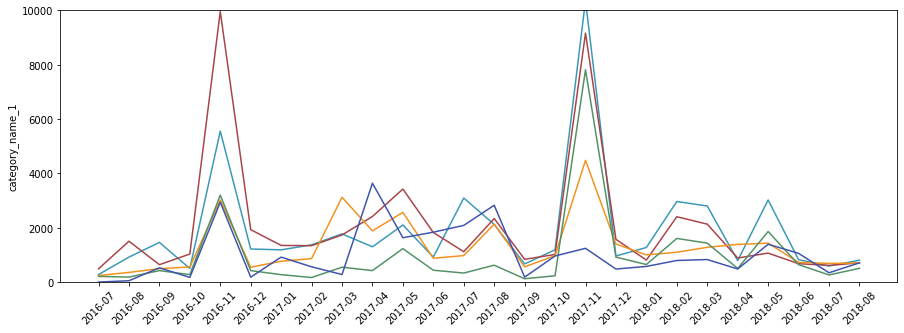 월별로 보면 꽤 깔끔합니다. 동시에 구매가 증가하는 것을 볼 수 있습니다. 음식은 상대적으로 거의 변하지 않는 것으로 보이며 다른 범주가 증가함에 따라 감소하는 경향이 있습니다.