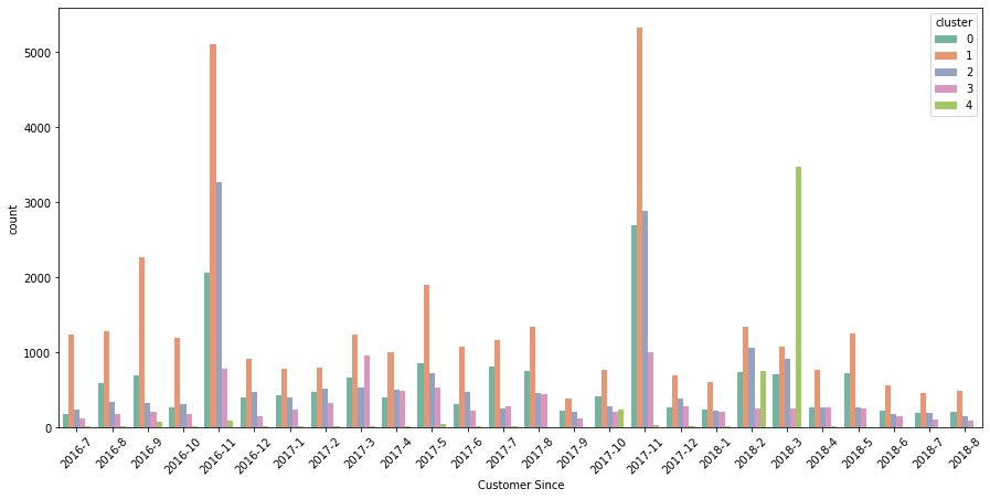 클러스터 0과 1은 2016년 중반부터 사용하고 있는 비교적 많은 사람들입니다. 클러스터 #3은 한때 널리 퍼졌던 2016년 11월 이후로 많은 사람들을 심각하게 만드는 것 같습니다. 4번 클러스터는 2018년경부터 본격적으로 가입한 후 2018년 3월에 가입한 사람들이 많다는 점에서 다소 독특합니다. 다른 사람들은 어떻습니까 그냥 보고 끝내고 싶네요.