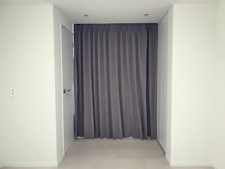 그리고 짐을 보관하는 작은 창고로 쓰이는 공간에는 어두운 색의 커튼이 설치되어 있습니다 불투명한 커튼이라 물건을 숨길 수 있어 좋았고, 외풍으로 인해 겨울에 찬바람이 들어오지 않을까 걱정돼 조금 두꺼운 것을 골랐어요.