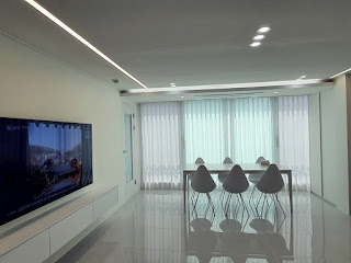 그다음에 정말 고민 많이 했던 장소가 거실이래요 집의 첫인상을 좌우하는 곳이 거실이라 대충 결정하지 못해 신경을 많이 썼죠. 저희 집에 가전제품이나 기존에 있던 가구들이 갈색이나 어두운 톤의 색채가 많아서 밝은 색상을 선택해서 설치했습니다. 창문 옆 사이즈가 생각보다 커서 블라인드는 3개에 맞게 달아달라고 했는데요. 햇빛이 들어오는 방향에 따라서 조절할 수 있는 점이 좋았어요 가족이 가장 많이 묵는 곳이라 청소가 편리해야 하는데 물티슈로 닦아주면 일감이 훨씬 줄었어요.