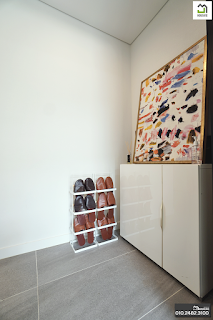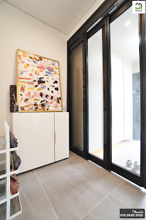 갤러리 같은 느낌을 연출하기에 적합한 내부 전실 공간이 마련되어 있으며, 3연동 슬라이딩 중문이 설치되어 냉방 소음 등으로 차단됩니다. 풋 등이 제작된 상하식 수납장은 많은 신발을 넣기에 전혀 부족하지 않은 4도어입니다.현관 주차장
