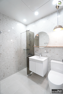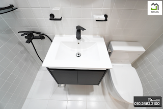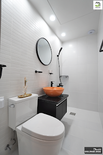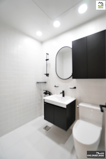 간단한 샤워가 가능하도록 에 준비된 깔끔한 블랙과 화이트 마감입니다.ROOM 3