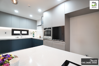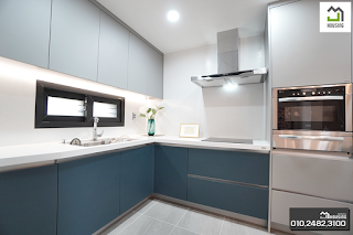 동선이 편리한 구조로 수납을 특화시킨 미니멀한 주방의 모습입니다. 아일랜드 테이블 하단에 있는 수납장과 쿡탑은 식탁으로 대신하여 취사와 동시에 식사를 즐길 수 있으며 “DIOS” 광파오븐과 인덕션 에어컨 등 실용적인 공간으로 마련되어 있습니다.다목적실
